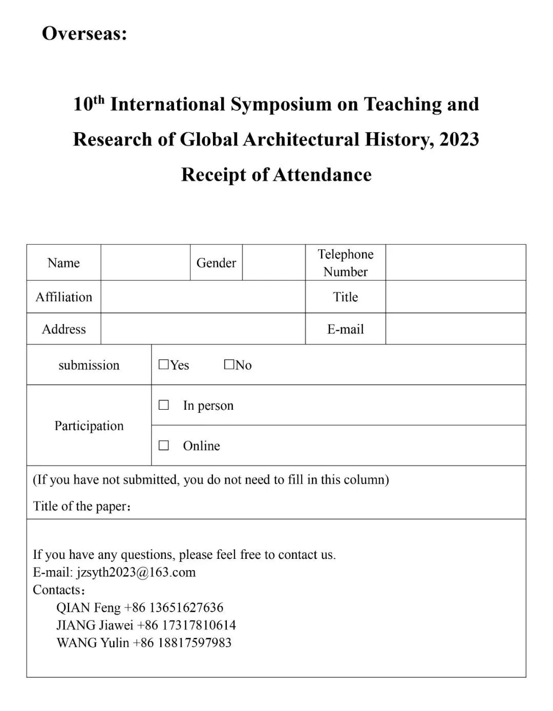 Send the participation receipt(link.docx)to the email address jzsyth2023@163.com. Those who have previously sent the participation receipt to this email address do not need to send it again.