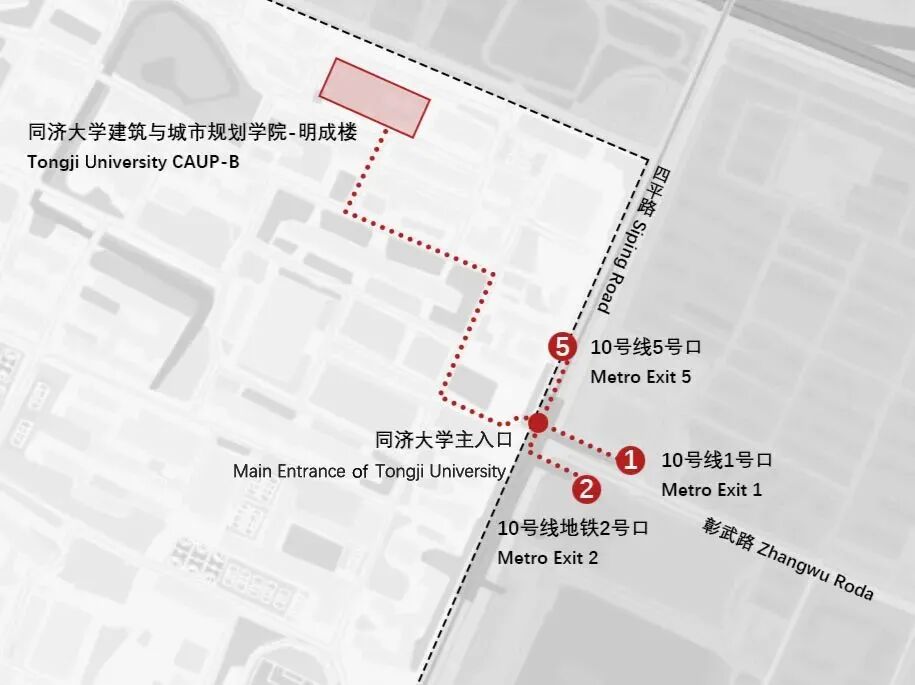 Take Metro Line 10 to Tongji University Station. It is recommended to exit from Exit 5 and walk about 20 meters to the main entrance of Tongji University. See the route map from the main entrance to the School of Architecture below.