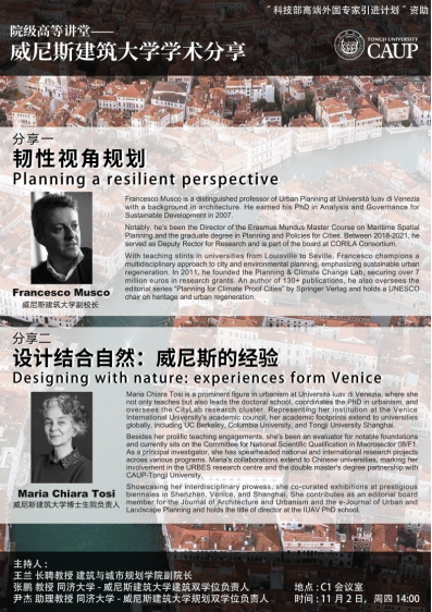 本场学术分享会围绕欧洲规划设计,开展了主题为:韧性视角规划、设计结合自然:威尼斯的经验,两个系列讲座。C1会议室座无虚席,50余位师生共同参加了本次讲座。