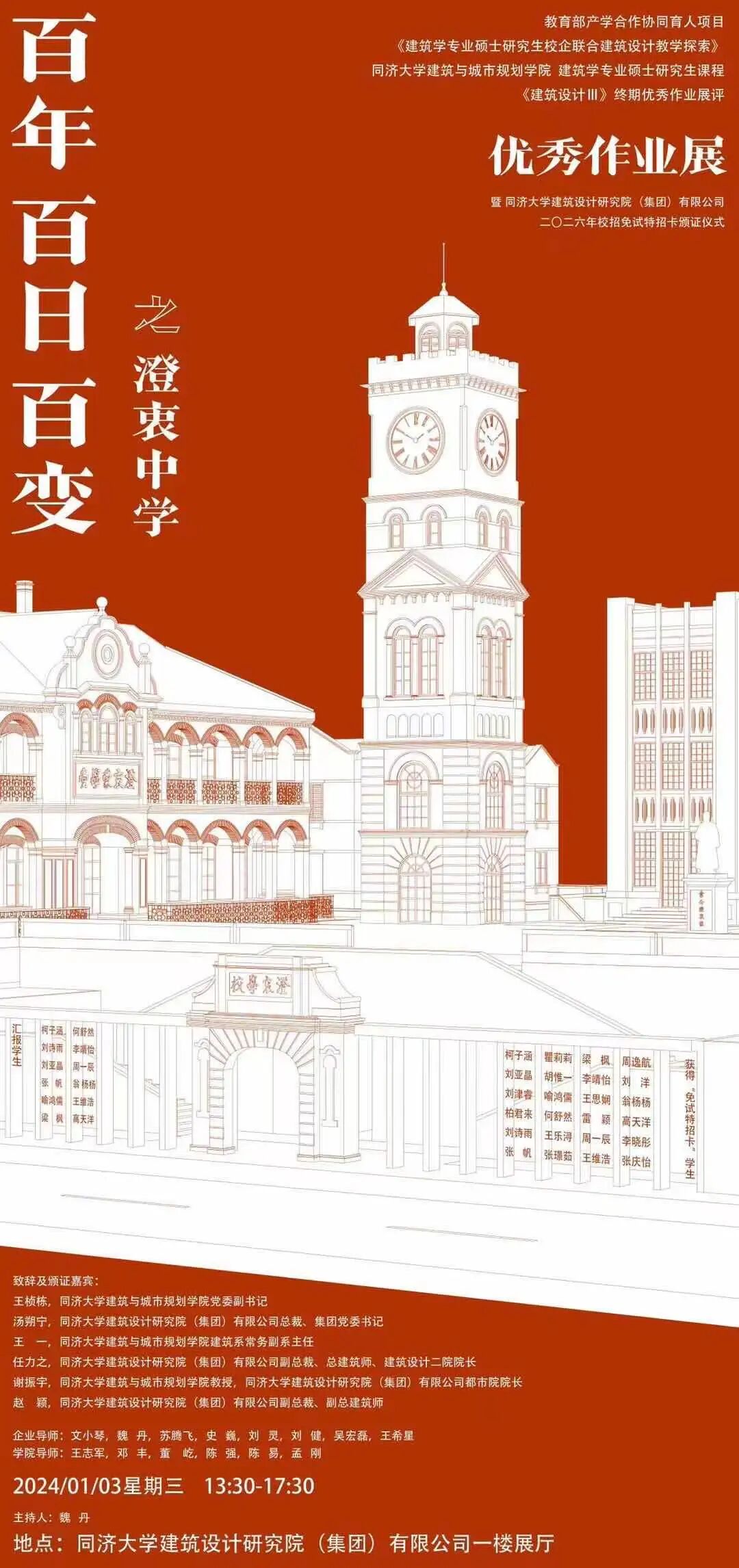 教育部产学合作协同育人项目《建筑学专业硕士研究生校企联合建筑设计教学探索》,同济大学建筑与城市规划学院建筑系专业型硕士研究生必修课程《建筑设计III》终期优秀作业展“百年 百日 百变 之 澄衷中学”于2024年1月3日下午13:30 在同济大学建筑设计研究院(集团)有限公司顺利举行。