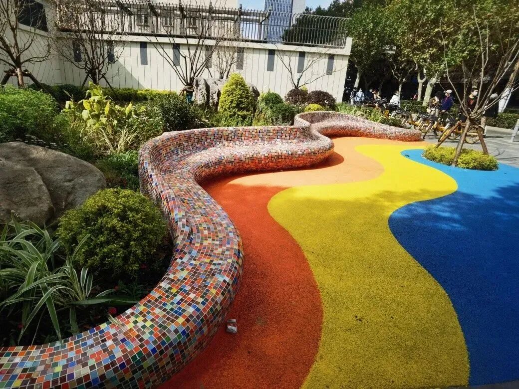 因地制宜,精准更新。项目使用半包围与弧线的设计语言,兼顾空间的开放性与独立性,保留部分绿地的同时,由弧线吸引匆匆的行人进入场地。激活了原本的灰色空间,活泼的彩虹色焕发了场地的活力,也使得小公园成为居民休闲交流的人气场地。通过小微空间景观改造提升,大大提升了居民的幸福感。