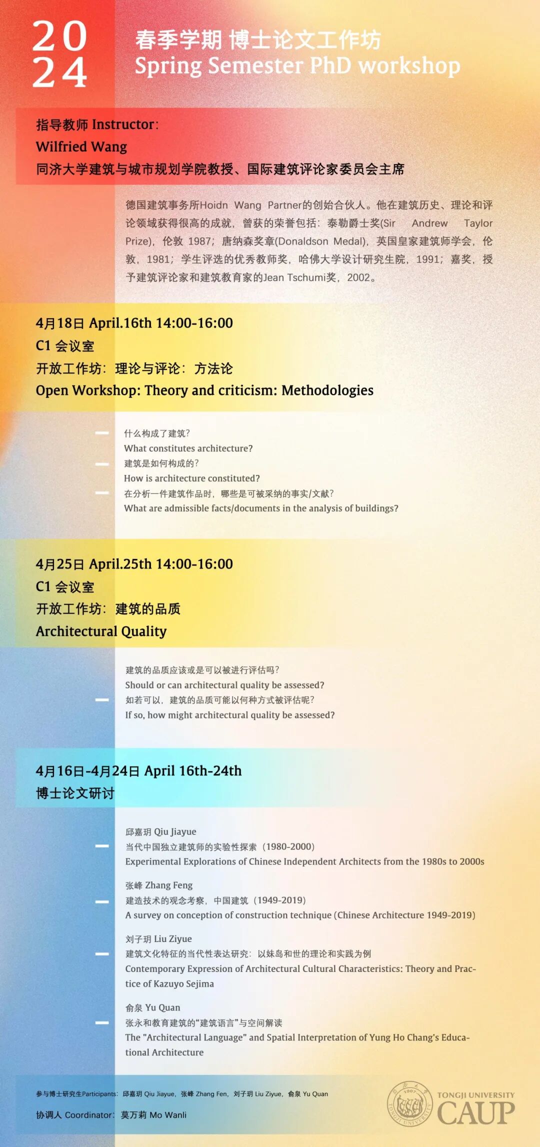本次博士论文工作坊旨在面向建筑理论与理论研究,由知名建筑历史与理论学者、评论家Wilfried Wang教授指导。工作坊将由两部分组成:两次开放的工作坊,分别围绕建筑理论与评论的方法论和建筑的品质这两大主题展开,以及若干围绕专题博士论文研究的研讨与推进。在两次开放工作坊中,Wilfried Wang教授将围绕相关主题进行讲座,并与参与博士研究生以及观众展开讨论。