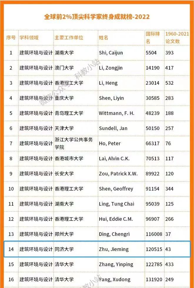 斯坦福大学2022年版全球前2%顶尖科学家榜单于10月10日发布,我院朱介鸣教授入选建筑环境与设计领域“终身科学影响力排行榜”!