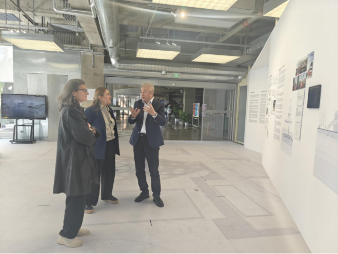 此外,双方回顾了同济与美丽城国立建筑高等学院的合作历史与成果,并就双学位项目的管理问题交换意见。针对项目运行中教学安排、学分认定、学生管理以及项目可持续发展等方面的问题,双方深入探讨并提出解决方案,旨在优化项目管理模式,提高运行效率,为学生提供更优质教育服务。在袁烽副院长的带领、卓健教授的讲解下,访问团参观了学院,并重点了解了2025Digital Futures工作营成果及学院C楼目前在展的“风生水起——基础设施公共化:实践及研究”展。