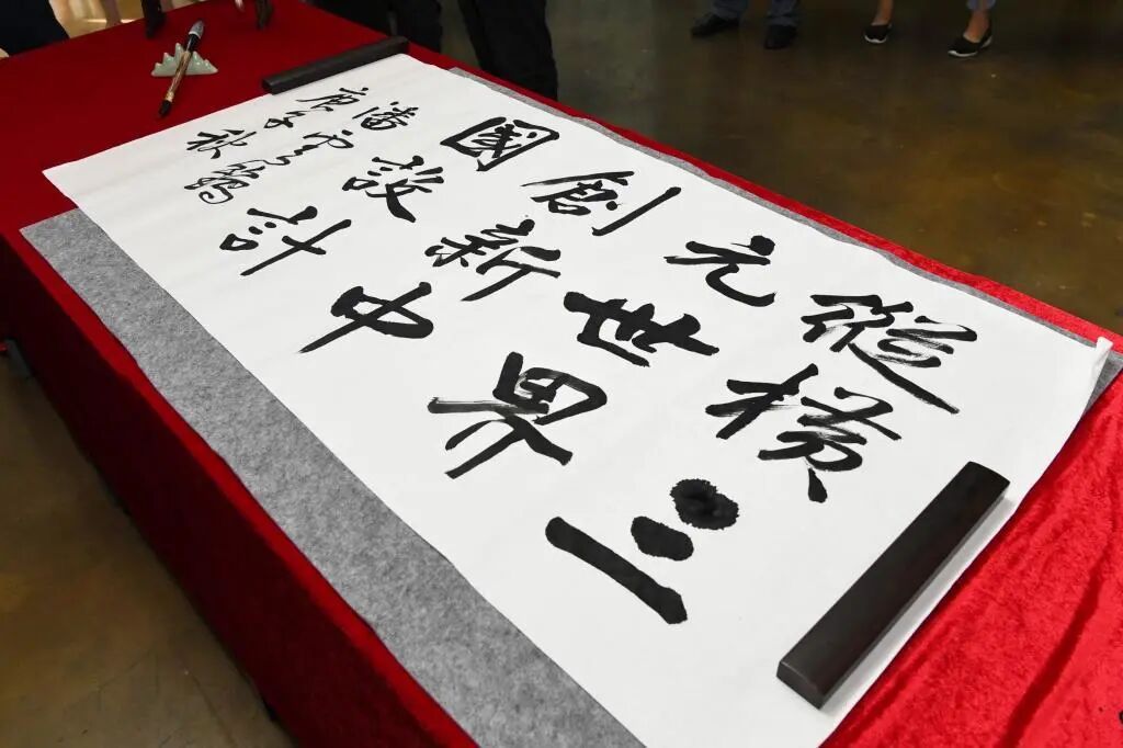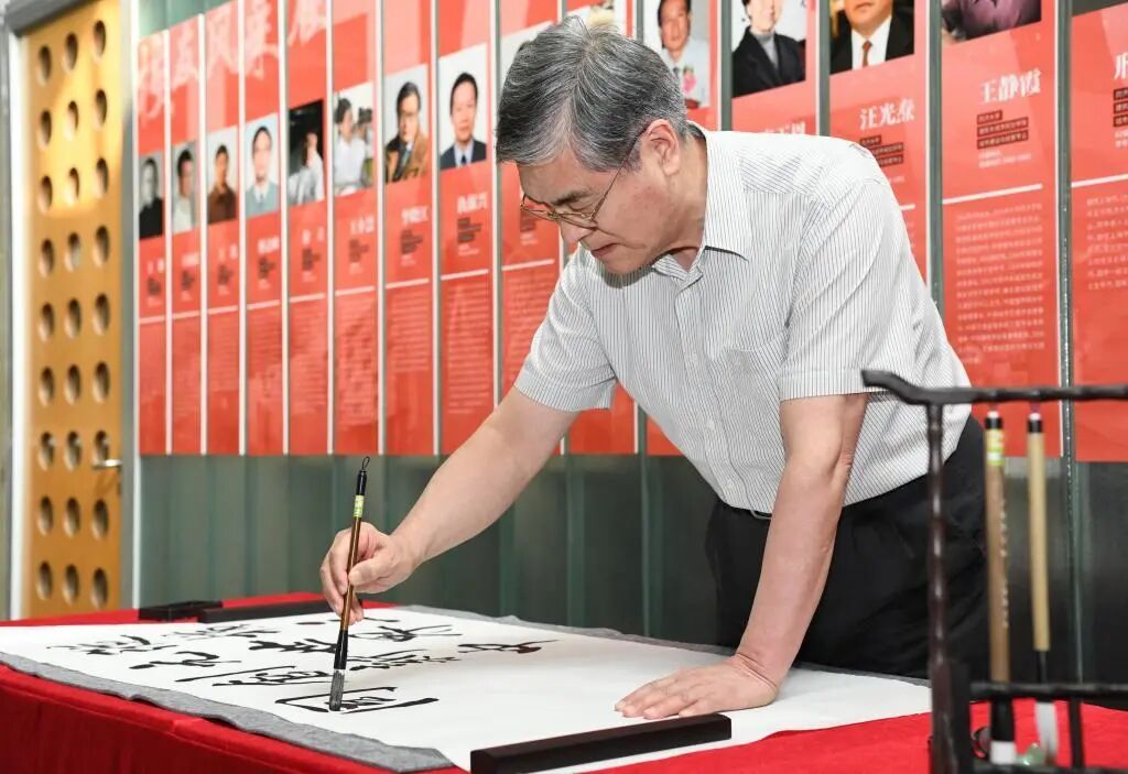 潘云鹤院士参观学院,并即兴挥毫,写下了“纵横三元世界,创新中国设计”。