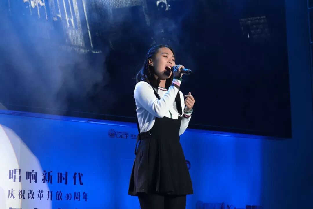 随后的学生诗朗诵《征程》则是00后们表达自己对于中国近代峥嵘岁月和四十年来激昂史诗的理解。由校园十大歌手比赛冠军张必清同学带来的独唱《从前慢》让在场观众如痴如醉,获得师生们的热烈掌声。