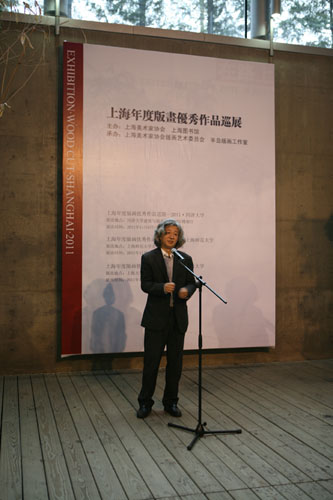 开幕式上,同济大学党委副书记姜富明、上海美术家协会秘书长陈琪、上海美术家协会版画艺术委员会主任卢治平、上海师范大学美术学院院长岳龙、上海大学美术学院徐龙宝教授等分别作了热情扬溢的致词,姜富明副书记充分肯定了建筑城规学院举办的系列艺术展并营造了浓厚的艺术氛围,此次与上海美术家协会联合举办画展又使同济大学与上海的艺术界有了进一步的密切交流,既是学校精神的延续又有新的拓展。上海美协秘书长陈琪在致词中则提到这次的版画艺术进高校的展出活动是一个创新,也是上海美协期盼了多年而这次在同济大学等三所高校支持下得于实现的目标。上海美术家协会版画艺术委员会主任卢治平希望与高校的结合能可持续地深入下去,将版画艺术与城市公共空间的环境营造相结合,这也是将此次展览的首站放在同济大学的初衷。上海师范大学美术学院和上海大学美术学院的嘉宾代表则对同济大学建筑城规学院所提供的出色展示空间和打造的学术交流平台表示衷心感谢。最后,建筑与城市规划学院吴长福院长感谢上海美协、上海图书馆和兄弟院校的支持,将上海近年来优秀版画作品“送宝”上门使我们的师生能有幸饱览最为前沿的版画艺术成果,我们将十分珍视此次直接接触高水准艺术真品的难得机遇,并宣布此次《上海年度版画优秀作品巡展》开幕。
