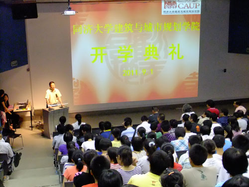 2011年9月1日上午,建筑与城市规划学院2011级本科生开学典礼在钟庭报告厅隆重举行。我院院长吴长福教授,党委书记彭震伟教授,副院长钱锋教授、周俭教授、黄一如教授,党委副书记刘颂教授,建筑系系主任常青教授,城市规划系主任唐子来教授,景观系副系主任周向频副教授,建筑系副系主任张建龙副教授、章明教授,院长助理张尚武教授、韩锋教授、李翔宁副教授,以及各行政部门的负责人出席了迎新大会,党委副书记王晓庆老师主持此次开学典礼。