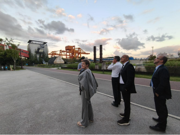 Later, accompanied by CAUP teachers, the delegation visited Yangpu Riverside. Doctoral student Wu You introduced iconic Shanghai urban renewal projects like Yangpu Power Plant Heritage Park. The delegation was impressed by Shanghai's urban renewal innovation.