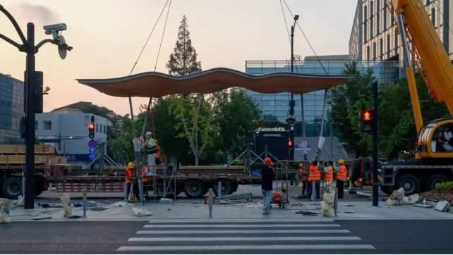 The newly - built Crossing Pavilion consists of a large and a small pavilion, resembling two canopies sailing together with gentle waves, providing shelter from rain and sun for teachers, students, and citizens waiting to cross the road.