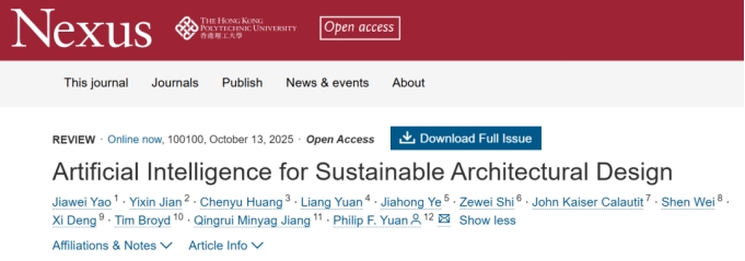 Recently, the team led by Professor Philip F. Yuan and Associate Professor Yao Jiawei from the College of Architecture and Urban Planning (CAUP), Tongji University, in collaboration with top-tier international research teams, published a research outcome titled Artificial Intelligence for Sustainable Architectural Design (AI4SAD) in Nexus, a cross-disciplinary journal under Cell Press.