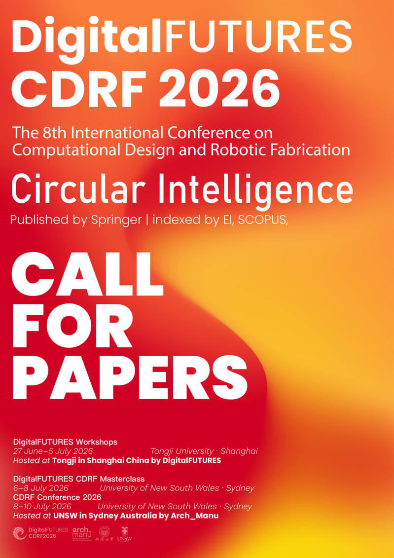 The 8th International Conference on Computational Design and Robotic Fabrication (CDRF2026)organized by the DigitalFUTURES Association, jointly undertaken by College of Architecture andUrban Planning Tongji University, Tongji ArchitecturalDesign(Group)Co., Ltd., and ArchitecturalIntelligence Journal, facilitated by Shanghai DigitalArchitecture Fabrication Technology Center, and Digital Architecture Branch, The Architectural Society of Shanghai China, has officially opened its call for papers! Over the years, the CDRF conference has consistently collaborated with Springer to publish high-quality papers. In 2023, CDRF conferencepapers were indexed by CumInCAD and Scopus, and starting from July 2024, all CDRF conference papers accepted after 2022 will be indexed by El Compendex.