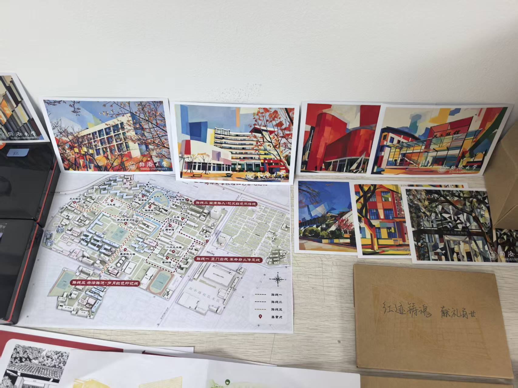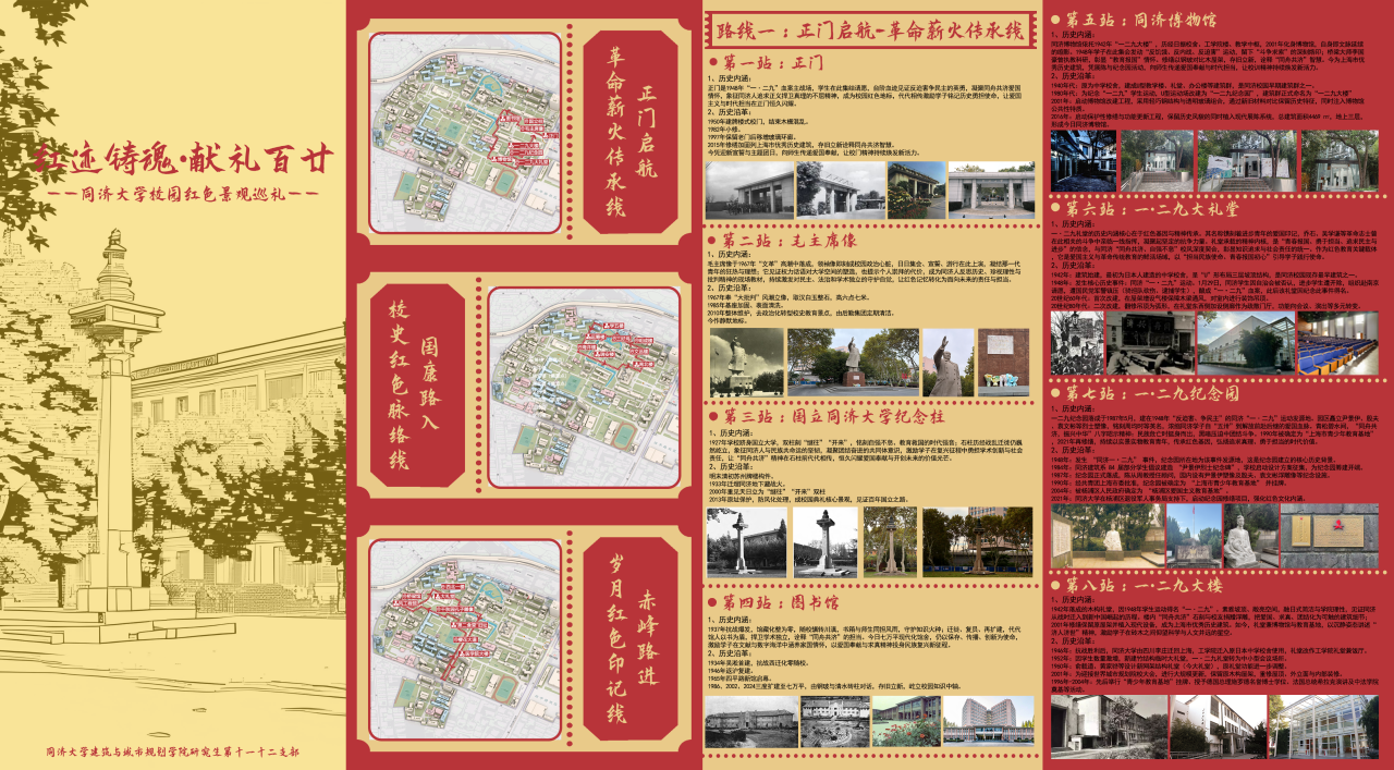 为献礼同济大学120周年校庆,建筑与城市规划学院研究生第十二党支部立足学科特色,扎实梳理校园红色景观资源,完成了“红色景观巡礼地图折页、盖章打卡、主题明信片”三项核心文创设计。