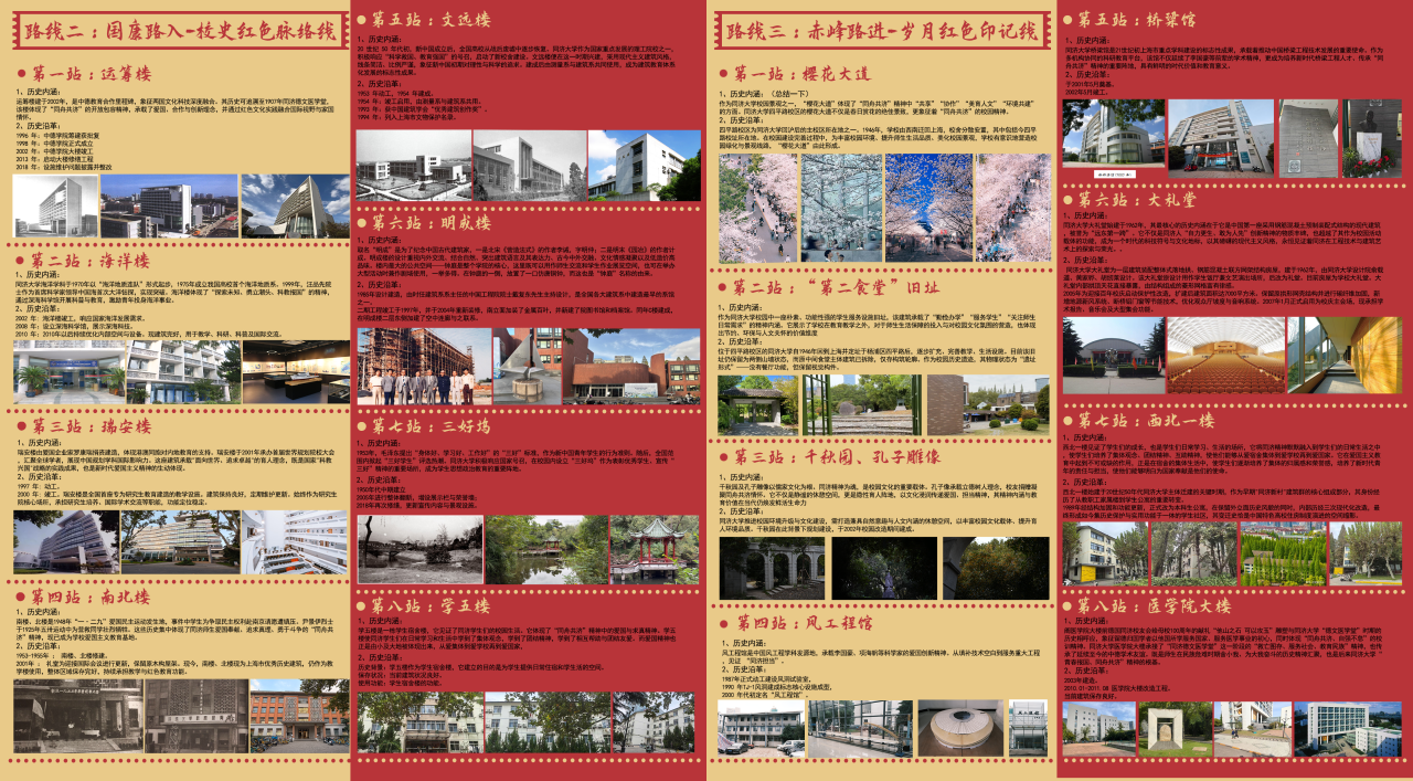 编制红色景观巡礼折页,实现手册化呈现。将三条路线图、24处景观点详细介绍整合为《同济大学红色景观巡礼折页》,采用地图导览、历史梳理、今昔影像对比等形式,形成便携式学习手册。折页在支部内部试运行,收集修改意见20余条,完成多轮修订,为后续推广奠定基础。