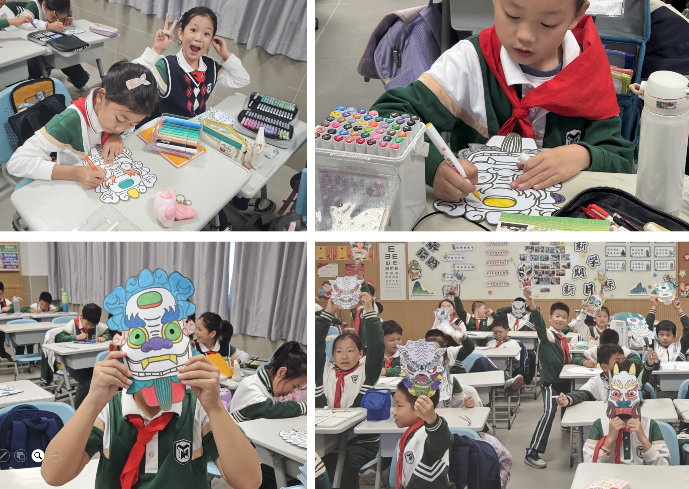 第一节手工课紧随故宫专题开展,小朋友们自主挑选喜爱的故宫脊兽原型,在老师指导下动手裁剪,搭配鲜艳色彩涂色装饰。完成作品后,孩子们纷纷戴上面具展示,沉浸式感受脊兽所承载的文化寓意。