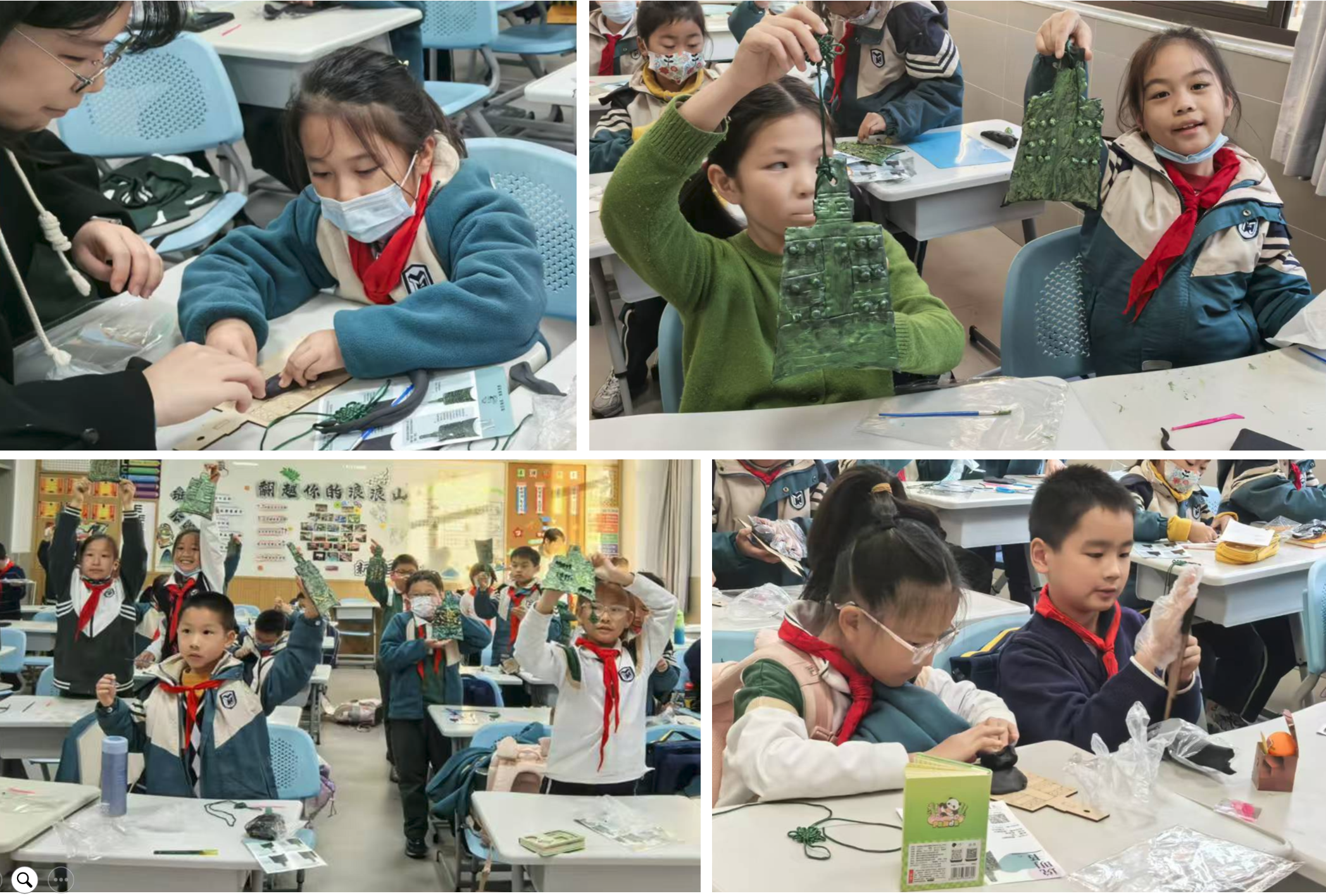 第二节手工课衔接陵墓专题,体验考古的趣味性。孩子们用不同颜色的手工泥,捏制编钟模型。在手工过程中,孩子们直观了解出土的青铜器具特色,体验传统工艺的制作流程,进一步加深对陵墓、考古文化的认知。