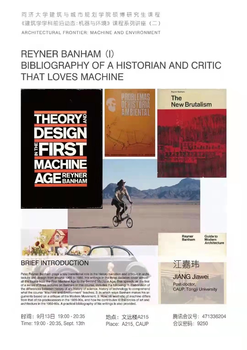 Peter Reyner Banham plays a key transitional role in the history narration and critique in architecture and design from around 1955 to 1985. His writings in the three decades cover almost all the topics from the First Machine Age to the Second Machine Age. This speech, as the first of a series of three lectures on Banham in this course, includes the following: 1. Elaboration of the differences between history of art, history of science, history of technology to comprehend what the course “Machine and Environment” teaches; 2. In which ways Banham makes his arguments based on a critique of the Modern Movement; 3. How his aesthetic of machine differs from that of his predecessors in the 1920-30s, and how he contributes to the circles of art and architecture in the 1950-60s. A practical bibliography of his writings is also provided.
