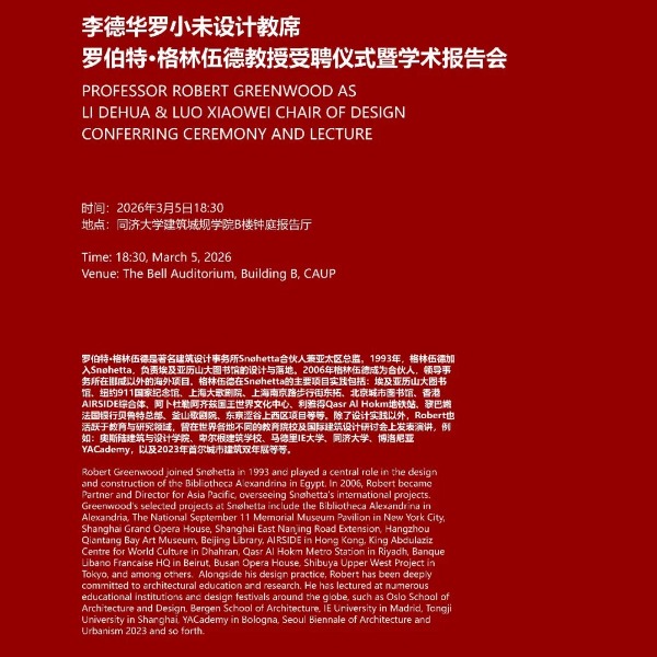 预告丨2026同济“李德华罗小未设计教席”Robert Greenwood教授受聘仪式暨学术报告会